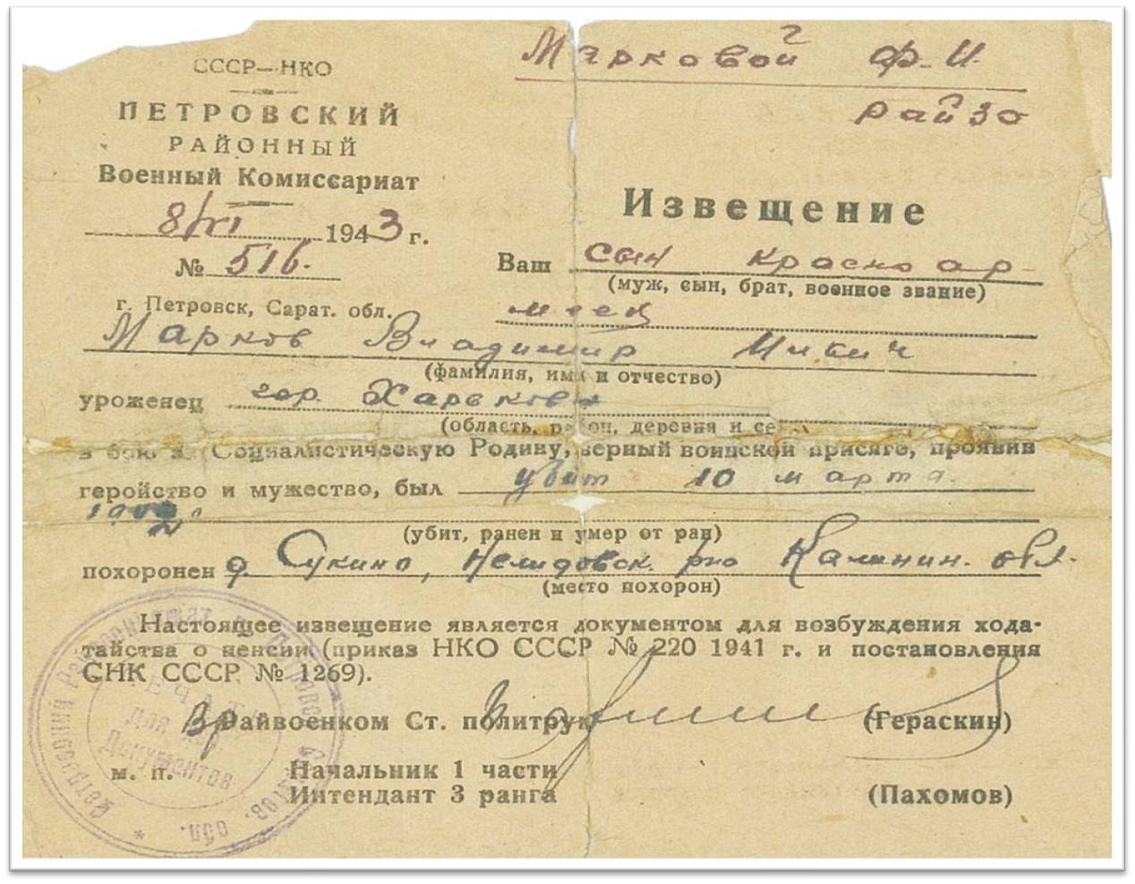 Володя Марков погиб в боях за деревню Сукино 10 марта 1942 года. Первоначальное захоронение было  расположено у этой деревни.